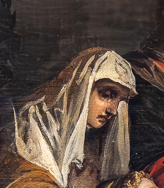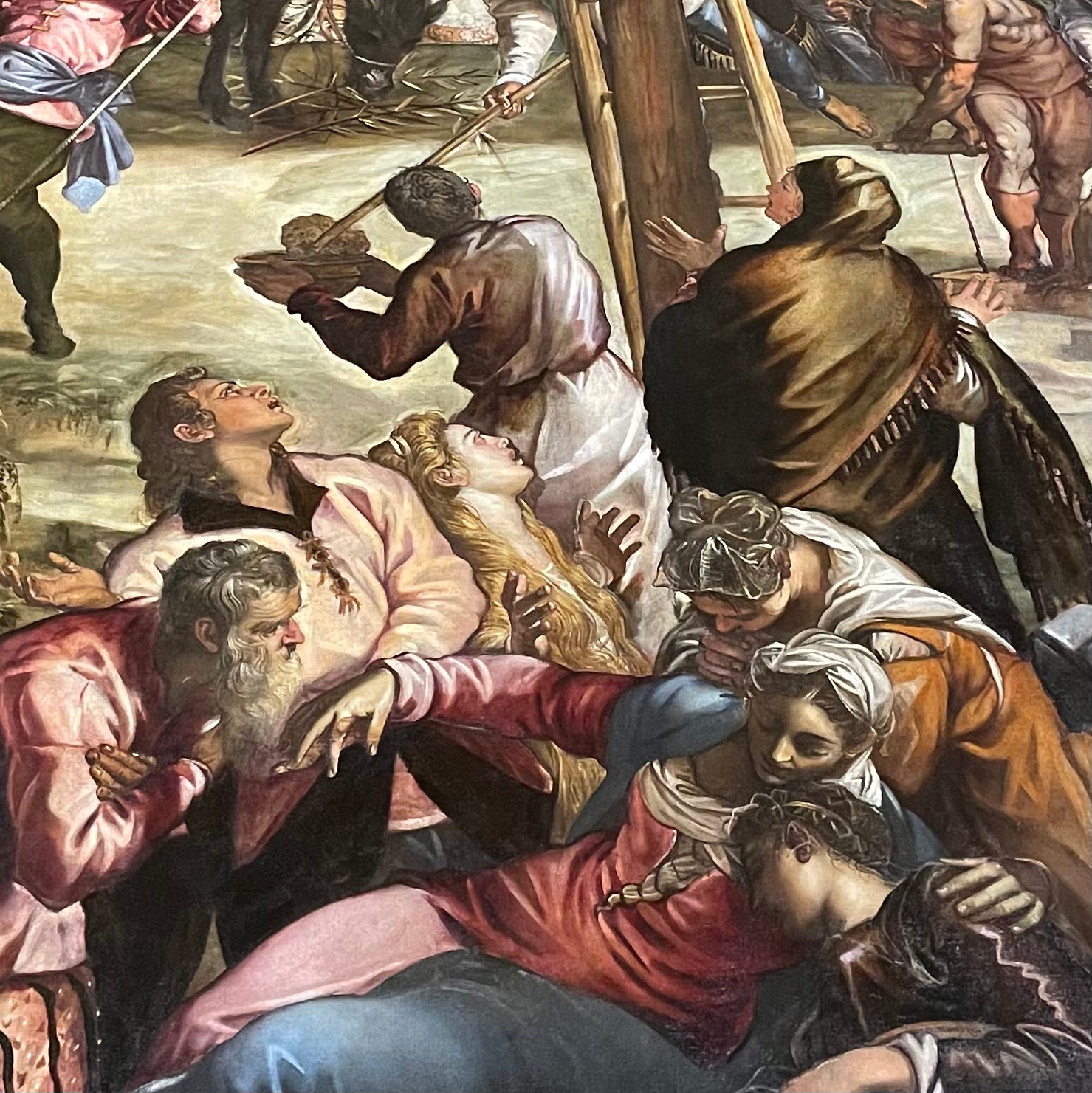 When I say “middling”, what I’m trying to nail down is the painting’s quality according to what I imagine the critical criteria of the day might have been, based on the paintings from the time that do have an identified author, and probably hang in museums, with tasteful lighting and a new frame and wall labels and even a bench in front of them. Compared to, say, Tintoretto, the depiction of extreme grief here looks a bit flat: compare the image of Mary Magdalene here, who’s the one in orange to the left of Christ, with the same figure in Tintoretto’s Crucifixion.