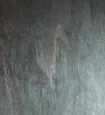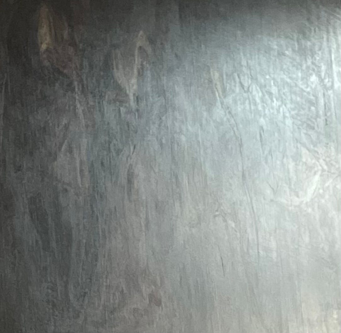 I think I can see – and this is where I wish I’d taken more photos of this – the shipwreck beneath the skin of the painting. Not shipwreck: skeleton. That is, the wooden stretcher around which the painting, which may have been sewn together from multiple smaller canvases, is – well, stretched. I think I can see how that surface would feel if you were to tap on it with the tips of your fingers. Like an old tambourine, with its slightly loose skin. (There was always one in any school music lesson, unusable). Or a snare drum with a slack surface, before you tighten the screws. I think I can see, as my imaginary fingers tap, the canvas slightly undulate and wobble in the light. I can also see how, were I to press hard with a single finger, I might be able to punch a hole right through and touch the wall behind.