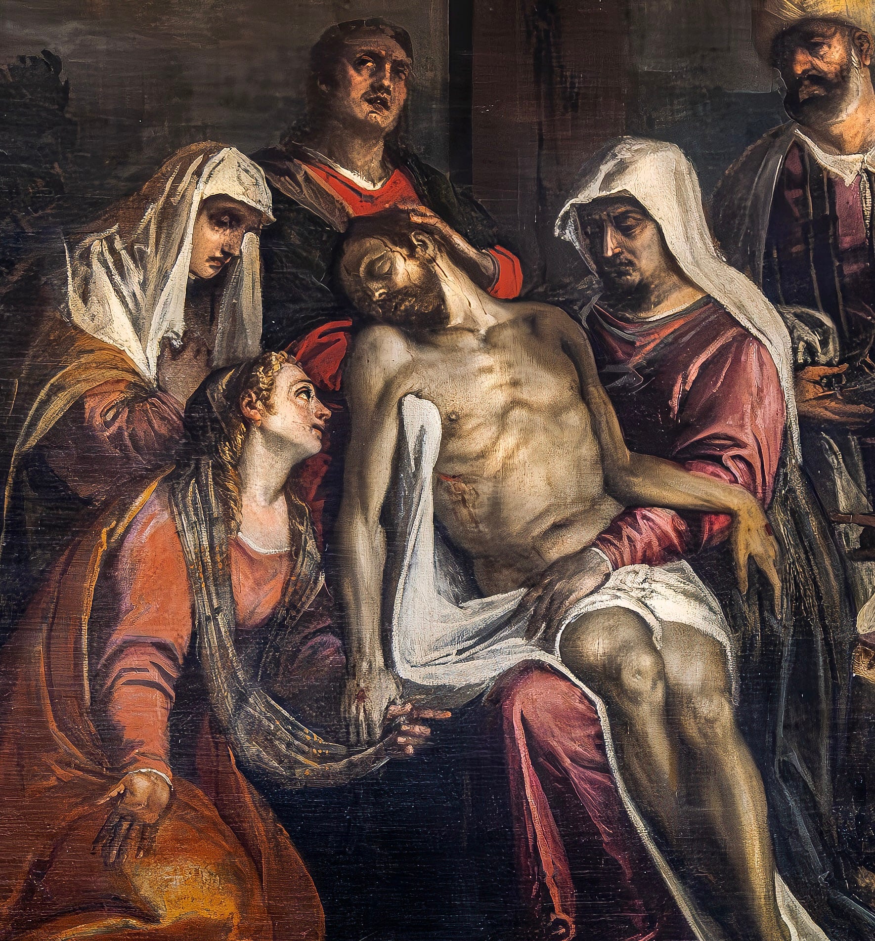 This one looks a little bored, listlessly rolling her eyes; Tintoretto’s is in the throes of abject grief, her eyes red with tears. This one falls short when it comes to emotional believability. Possibly anatomical believability too: Christ’s thighs look too short, for example. By what I think of as the standards of the time, these look like failures. By the standards of art resembling human life, then, it doesn’t quite make it. If you imagine those thighs are real thighs, in other words, they don’t look much like thighs.